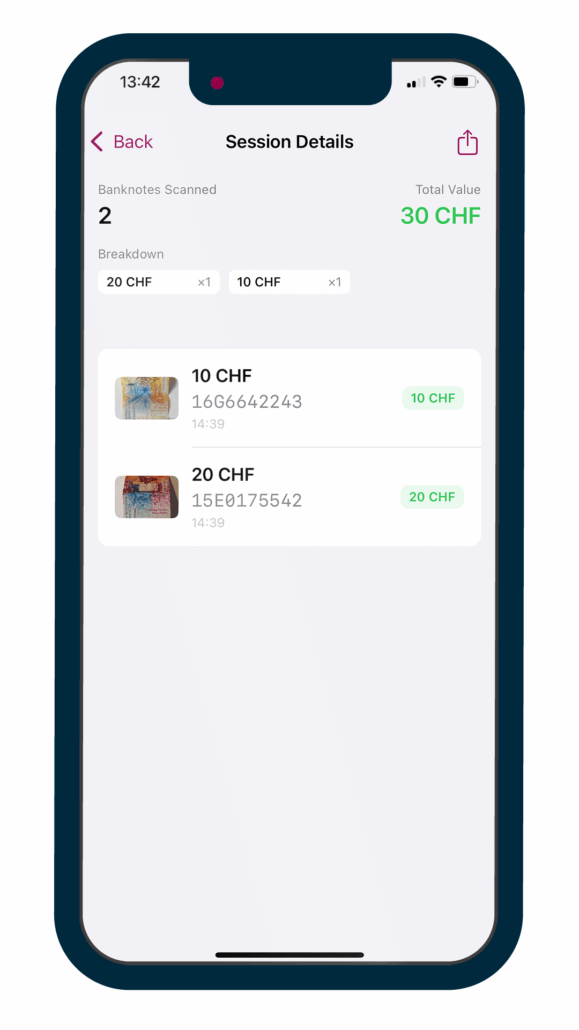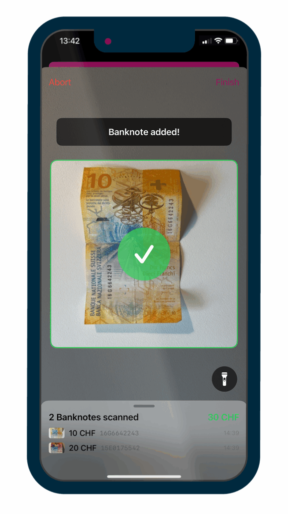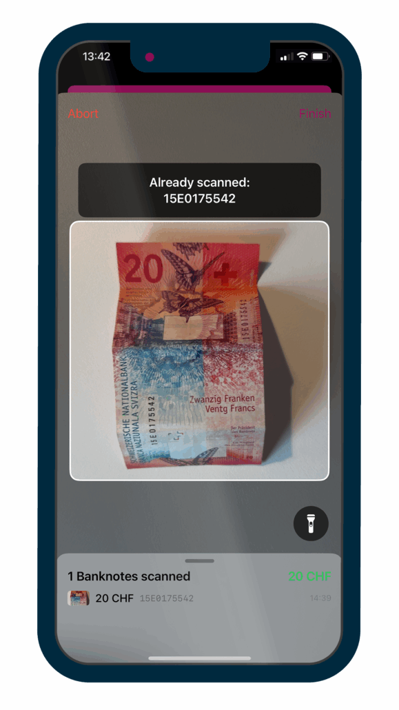 Using their duty phones, police officers or law enforcement personnel can batch-scan banknotes found or obtained during their work, for example in house searches, arrests, identity or vehicle checks.